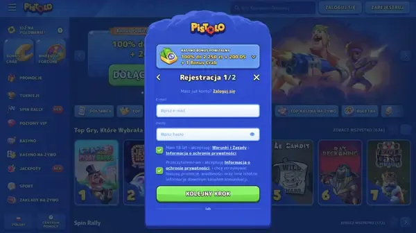 Otwórz naszą stronę i wybierz przycisk rejestracji, aby rozpocząć rejestrację w Pistolo. Jeśli dostępna jest oferta powitalna, możesz wybrać ją na tym etapie, aby została przypisana do Twojej pierwszej kwalifikującej się wpłaty. Możesz też wybrać preferowaną sekcję (kasyno, gry na żywo lub zakłady sportowe) z głównej nawigacji po zakończeniu rejestracji. Jeśli widzisz pole promocyjne, wpisz kod tylko wtedy, gdy otrzymałeś go z naszych oficjalnych kanałów. -